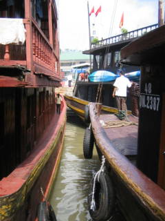 左の写真は我々のグループが乗りこむ船への道です。この狭い船べりを伝って最も沖に停泊していた船に乗り込んだのです。桟橋はありませんので、手前の停泊している船が桟橋の代わりなのです。右の写真はこの船でいよいよ始まるハロン湾クルージングの入り口の写真です。港からは約20分くらいだったと思います。