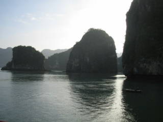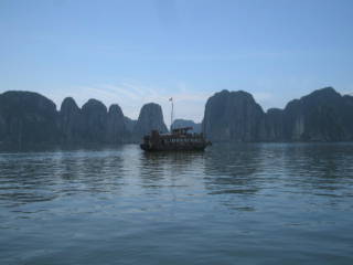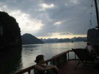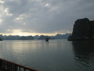 夕方になるとジャンク船は、夕日の見えるポイントに碇を下ろす。そこからが壮大な日没ショーの始まりだ。帆をあげたジャンク船、後ろには林立する奇岩群、そこに沈んでいく真っ赤な夕日。まさに絵に描いたような風景とはこのこと。(残念ながら写真はありません。バッテリーが上がってしまったからです)