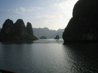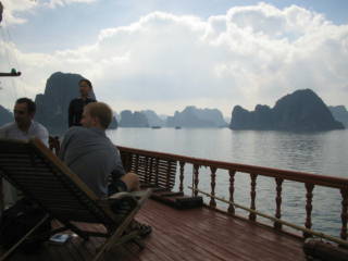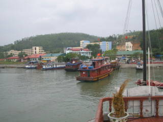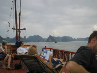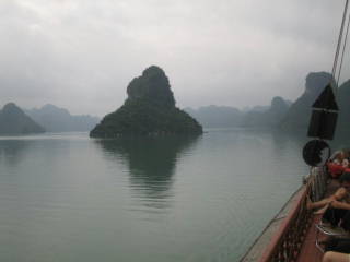 左の写真のようにのんびりとデッキで寝そべりながら、移り行く雄大な景色を堪能する贅沢な旅でした。のんびりとのんびりと・・・・それに途中で気が付いたのですが、この船のエンジンの音が本当に静かでした。相当高い技術が無いとこのような快適な船は出来ないと思いました。そしてたどり着いたハロン湾の中心である鍾乳洞のある港に到着です。(右の写真です)
