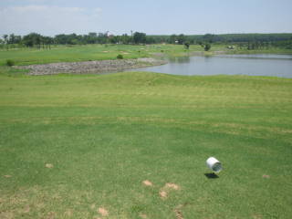 気を取り直して、メンバーが打ち終わった後に、今一度ティーショットしたら今度はその道の左側横にある池にドボンでした。今までの快ペースが一度におじゃんになり、なんとこのパー5で8叩きました。