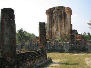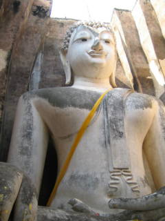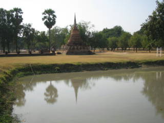 上の写真はワット・マハタートを1周したときに斜め後ろからワットを見たところであります。池に映ったわっとは美しい姿でした。右はほぼ正面から見たワットです。中央に仏像があります。お姿を池に映しスコタイ遺跡の中心であります。2004-12-31撮影