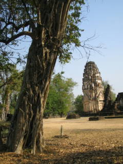 上の左の写真はワット・ソラサクです。このように仏塔の台座を像がささえています。これはスコタイ様式と言うのだそうです。右はこのあと訪れたワット・プラバイ・ルアンです。正面からみた写真ですがこの木の根元はこのように多くの根が大地に根ざしていました。いずれも2004-12-31撮影