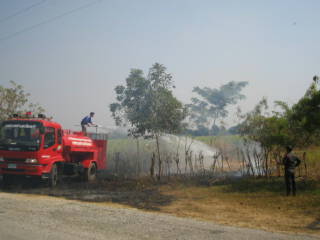 私が、このワット・サパーンヒンの入り口に着くとなんとこの消防自動車が周囲の畑の火事を消す為に放水中でありました。最新鋭の消防自動車がこんな田舎において活躍しているのでね。
