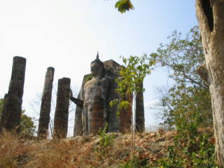 ところでこのワット・サパーンヒンに行くには約100段ほどある石段を登ります。結構きつい登りであります。頂上では高さ12.5mの立像が右手を上げ、東の方向を向いています。
