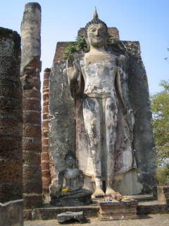 上の左の写真は丘の頂上にあるワット・サパーン・ヒンの全景です。丘の上からスコタイの遺跡を優しく眺める仏像がこのように安置されています。近くによって撮影したのが右の写真です。2004-12-31撮影