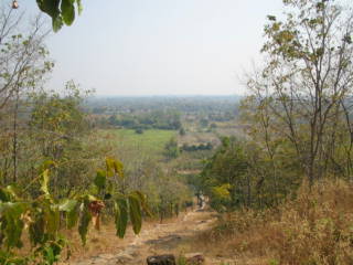 上の写真はワット・サパーン・ヒンの上り口での消火作業。右はこの丘に登って遺跡群あるスコタイの平原を望んだ所、正面の小道を下からテクテクとこの丘まで歩いてくるのである。