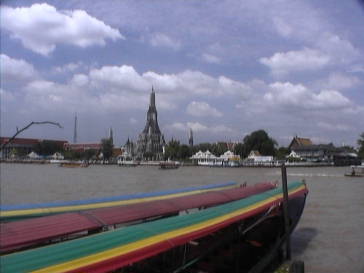 一周しながら適当に出た門の外でトクトクを拾い、ターティエンまで25バーツで交渉が成立し、乗り込みました。カミさんはトクトクが初めてでした。 このターティエンにてビールを1本注文し、チャオプラヤ川の船の行き来を眺めて時間をつぶしました。午前8時30分にホテルを出て、11時までにここまで来ました。 川の向こうに君臨する、ワットアルン(暁の寺)に2バーツで渡し舟に乗りました。 相変わらずのチャオプラヤ川の交通は頻繁に行き来する船で、その変化に飽きが来ません。 ワットアルンにもおまいりして、当面の観光としました。ここのみやげ物店にて着る物も買ってみました。いわゆる屋台価格であります。 また2バーツでターティエンに戻ってきて、タニヤのジムトンプソンの店と伊勢丹に立ち寄りお土産を買い込んでホテルに戻りました。